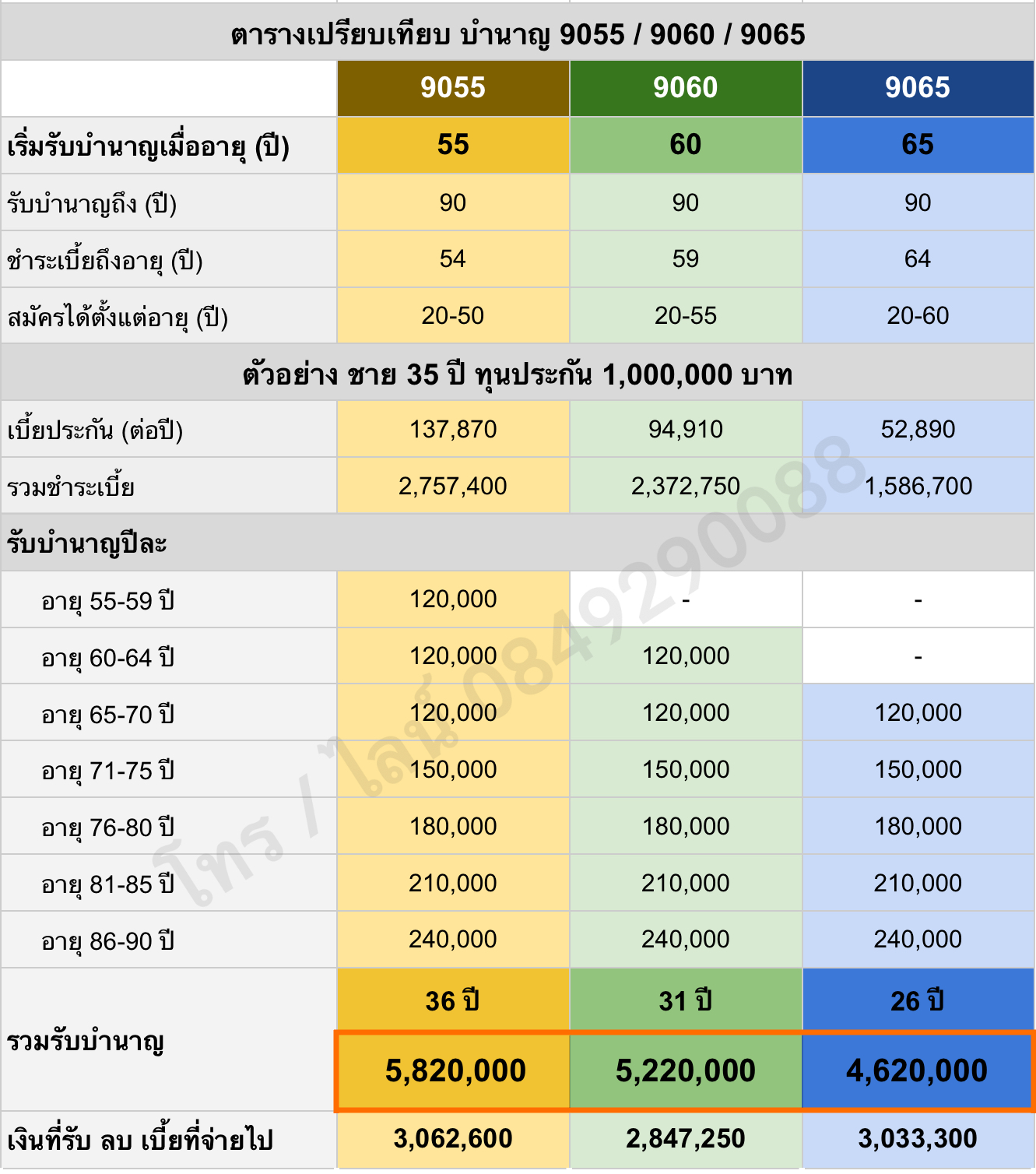 และขอยกตัวอย่าง สรุปการชำระเบี้ย และรับเงินบำนาญ ของประกันทั้ง 3 แบบนี้ โดยใช้เป็นเคสของ ชาย อายุ 35 ปี ทำประกันที่ทุน 1,000,000 บาทค่ะ